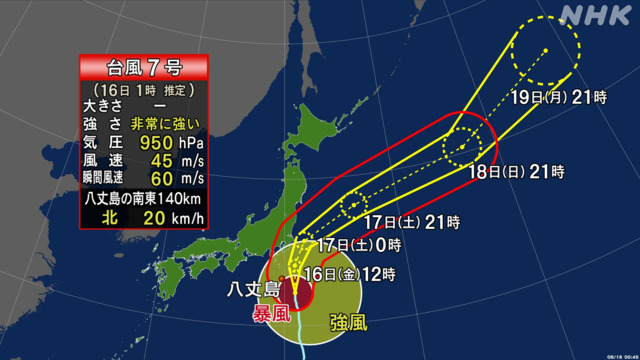 台風7号は、非常に強い勢力に発達し、伊豆諸島南部の一部を暴風域に巻き込みながら北上しています。台風は、16日から17日 土曜日にかけて東日本や東北に接近し、関東や伊豆諸島、山梨県では16日にかけて線状降水帯が発生して災害発生の危険度が急激に高まるおそれがあり、暴風や高波、土砂災害などに厳重に警戒してください。風や雨が強まる前に備えを進めて安全な場所で過ごすようにしてください。